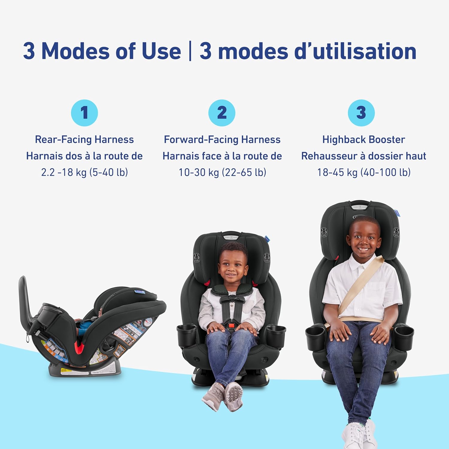 - 3-in-1 Versatility — Rear-facing harness (5-40 lb / 2.2-18 kg), forward-facing harness (26.5-65 lb / approx. 12-30 kg), and highback booster (40-100 lb / 18-45 kg, 43-57" tall, 4+ years old)