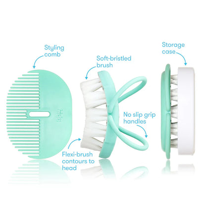 Keep baby's do smooth with this head-hugging, super soft brush + styling comb. Brush hair gently from scalp towards the hair tips to distribute the natural oils evenly. Includes, Head-hugging brush, Styling Comb + Snap-In Case for storage.